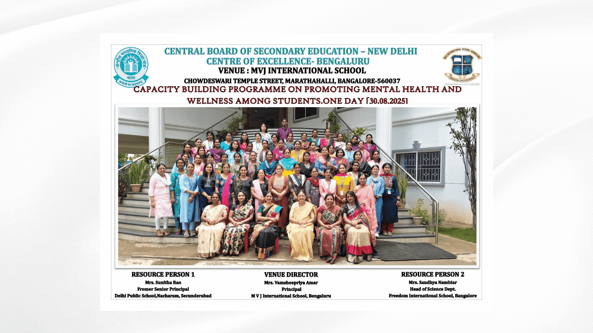At MVJ International School, we recognize that education extends far beyond textbooks and exams. In line with this vision, our educators recently participated in a CBSE Centre of Professional Development (CPB) Training on the theme “Promoting Mental Health and Wellness among Students.” This insightful session was conducted as part of CBSE's ongoing efforts to equip teachers with strategies to support students’ emotional and psychological well-being.