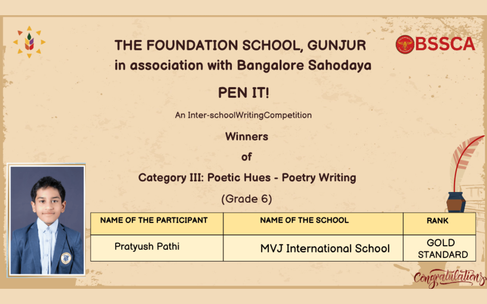 We are delighted to share that Pratyush Pathi of Grade 6 from MVJ International School has secured the Winner Position and the Gold Standard Rank at Pen IT!, an inter-school literary writing competition. We congratulate him on this outstanding achievement and appreciate his hard work, dedication and remarkable creative ability.