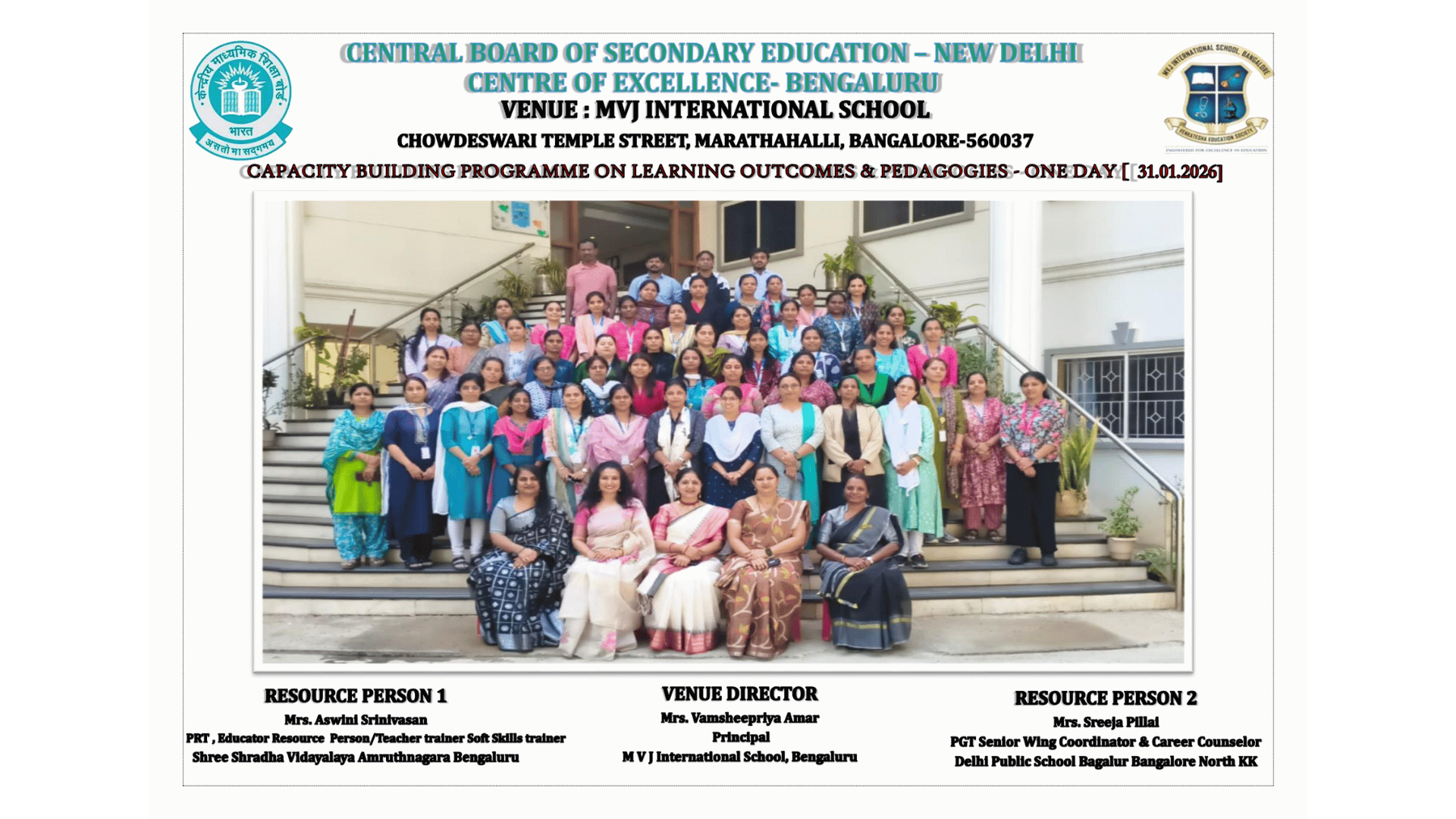 MVJ International School educators actively participated in the CBSE Capacity Building Programme (CBP) Training on Learning Outcomes & Pedagogies 2026, aimed at enhancing effective teaching practices and student learning experiences. The session focused on outcome-based education, innovative pedagogical approaches, and strategies to foster critical thinking, engagement, and holistic development among students. The training provided valuable insights that will further strengthen classroom practices and support the school’s commitment to delivering quality, learner-centred education.