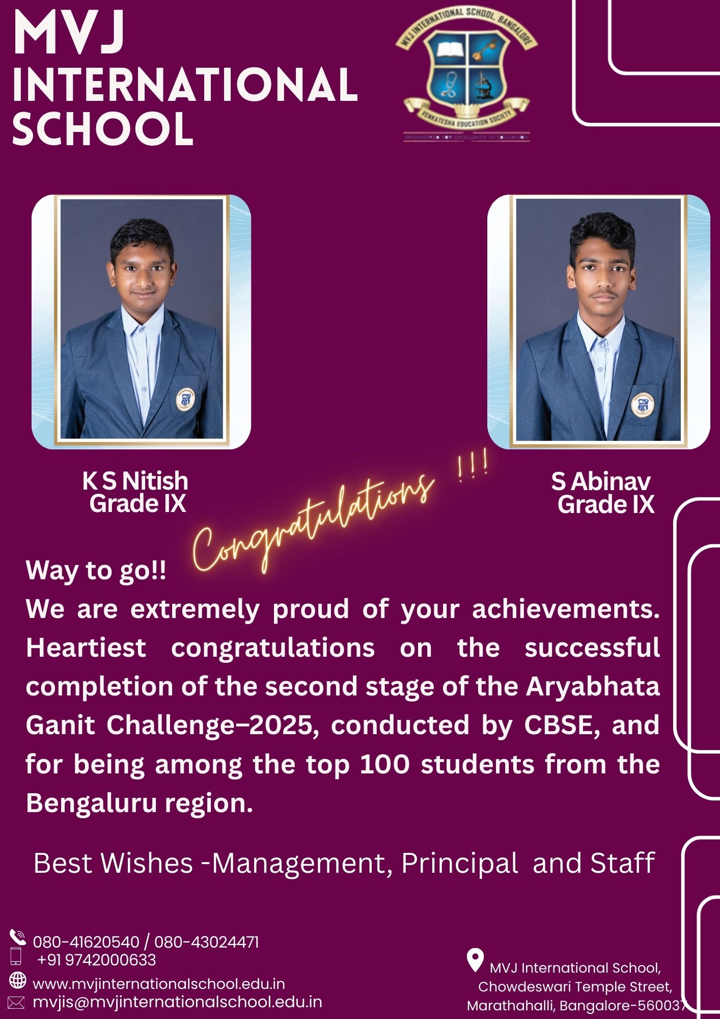 We extend our heartiest congratulations to KS Nitish and S Abinav on this significant milestone. Their success brings immense pride to the entire school community and serves as an inspiration to their peers.